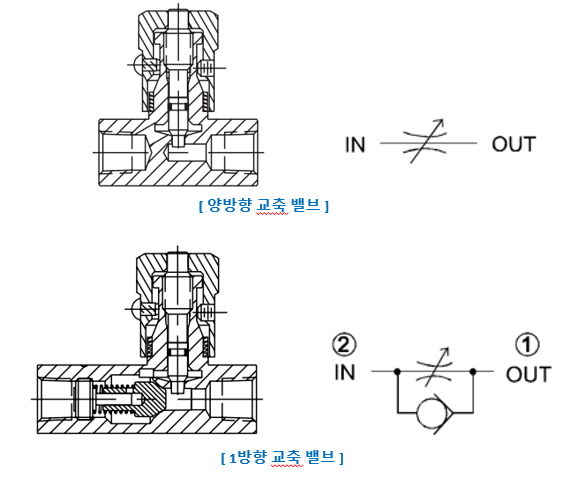 니들( Needle, 또는 Stem 스템)로 작동유가 통과하는 단면적을 줄여가며 유량을 조절하는 밸브이다. 교축 밸브라는 용어도 널리 사용되며 유량 조절 밸브라는 용어도 사용되는데 엄밀히 따지면 구분되어 사용되어야 하는 밸브이다. 아래 첫번째 그림은 양쪽 방향 모두 유량 조절을 할 수 있게 만든 "양방향 교축 밸브"이여 이 밸브는 현장에서 교축 밸브 또는 니들 밸브라고 불린다. 두번째 그림은 한쪽 방향으로는 체크 기능이 있어 한쪽 방향으로는 자유 흐름 (Free Flow) 그리고 그 반대 방향으로만 유량 조절 기능이 있다. 따라서 "1방향 교축 밸브"라고 불러야 밸브의 기능을 정확히 전달한다.