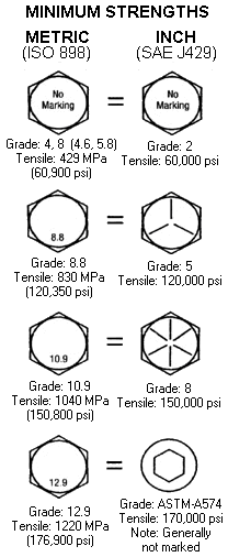 미리 계열 볼트는 육각 볼트이든 소켓 헤드 볼트이든 CLASS 가 찍혀있다. 인치 계열 볼트는 볼트 머리의 부호를 보고 GRADE를 판별해야 한다. 중장비 부품의 경우 육각 머리 볼트는 CLASS 10.9 을 표준으로 하는 게 바람직하다. 소켓 헤드 볼트는 12.9가 일반적이다. CLASS 10.9이면 GRADE 8이고 CLASS 8.8 이면 GRADE 5 쯤 된다.