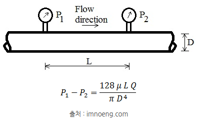 여러가지 공식이 있으나 Poiseullie's Law 로 알려진 아래 공식이 가장 사용이 편리하다. 유압 시스템 설계시 모든 관로나 호스 크기 및 길이를 선정하는 데 이 공식을 사용할 필요는 없으나 시스템의 현상을 이해하고 트러블 슈팅 할 때 유용한 공식이다.