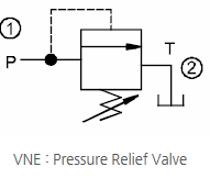 - 카트리지 릴리프 밸브인 VNE 밸브 심볼을 보면 정상 상태에서 ( 그림에서 보이는 ) 1 과 2가 닫혀 있는 상태임을 알 수 있다. 따라서 NC 즉 정상 닫힘 밸브이다.